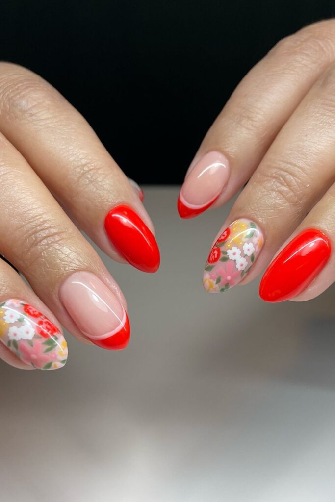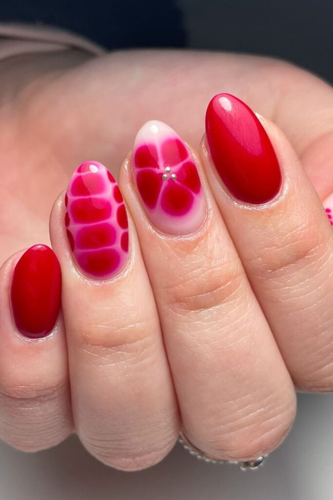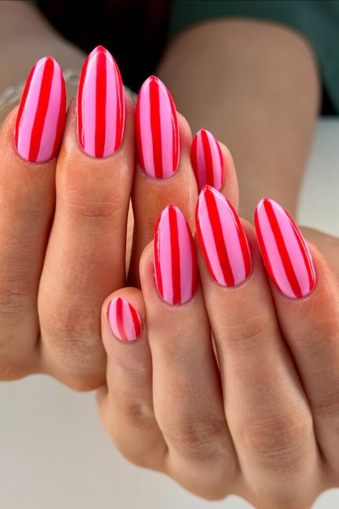 You pair red with soft pink to create a sharp contrast that fits almond shapes.
