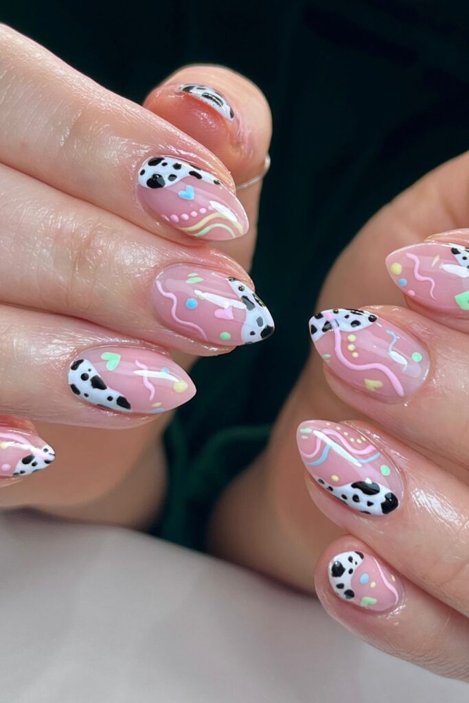 You mix hearts, squiggles, and cow spots to create a playful set that suits casual days.