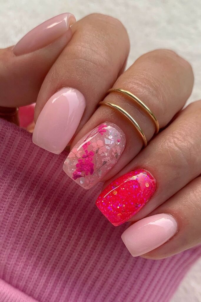You add glitter accents to create a small pop that still stays gentle for short or square nails.