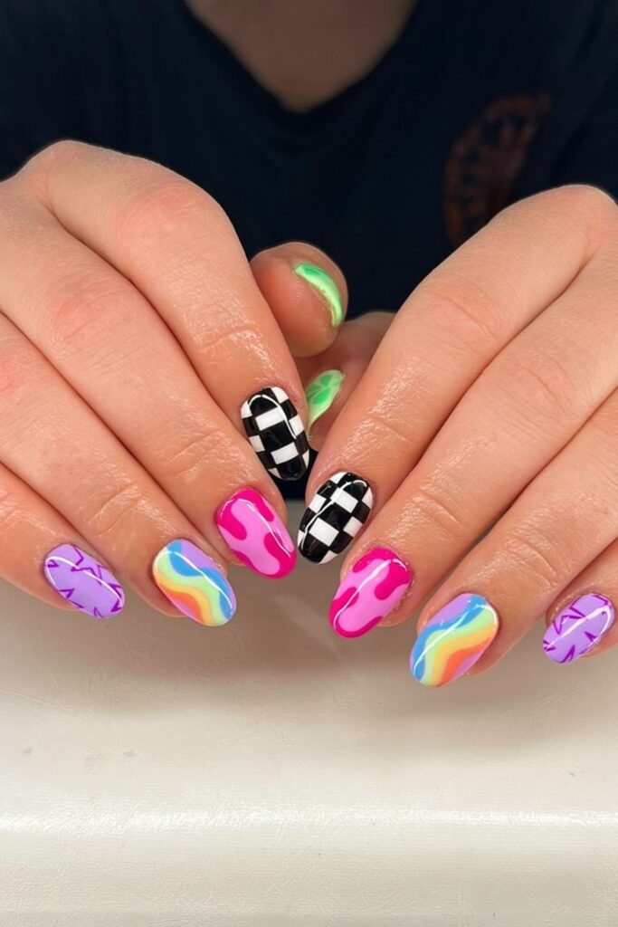 You mix checkers, waves, and neon drips to create a high energy set that fits parties or content shoots.