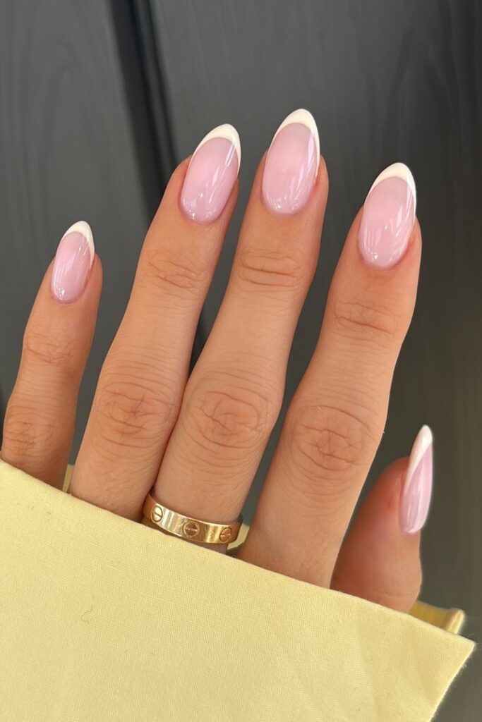 You keep the tips thin so the white edge looks soft instead of sharp on the sheer pink base.