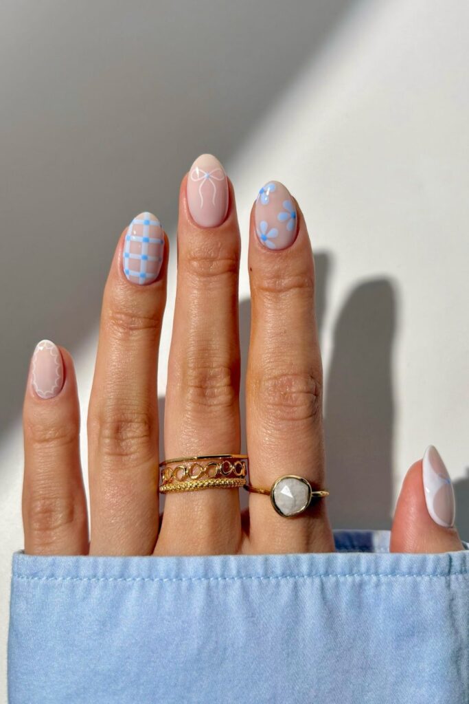 You match soft blue art with a nude base when you need a clean April idea that feels light.