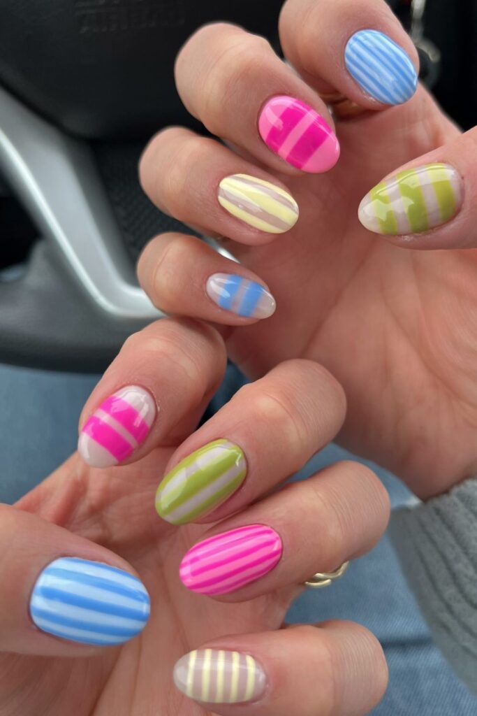 You try bright stripes when you want playful April nails that show color without extra art.
