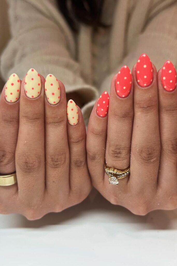 You tap coral and pastel yellow when you want bright nails that stay simple for April days.