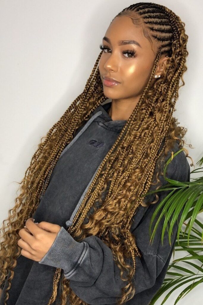 You notice how these honey curls add soft depth that lifts the full braid flow.