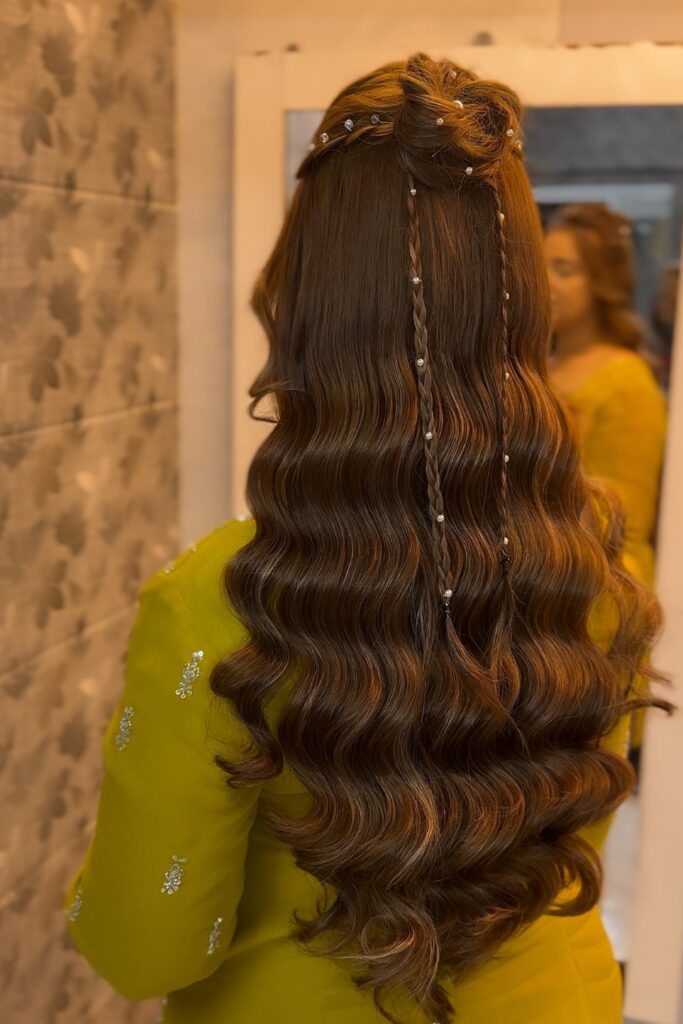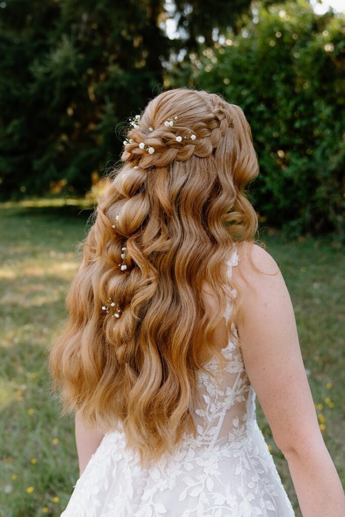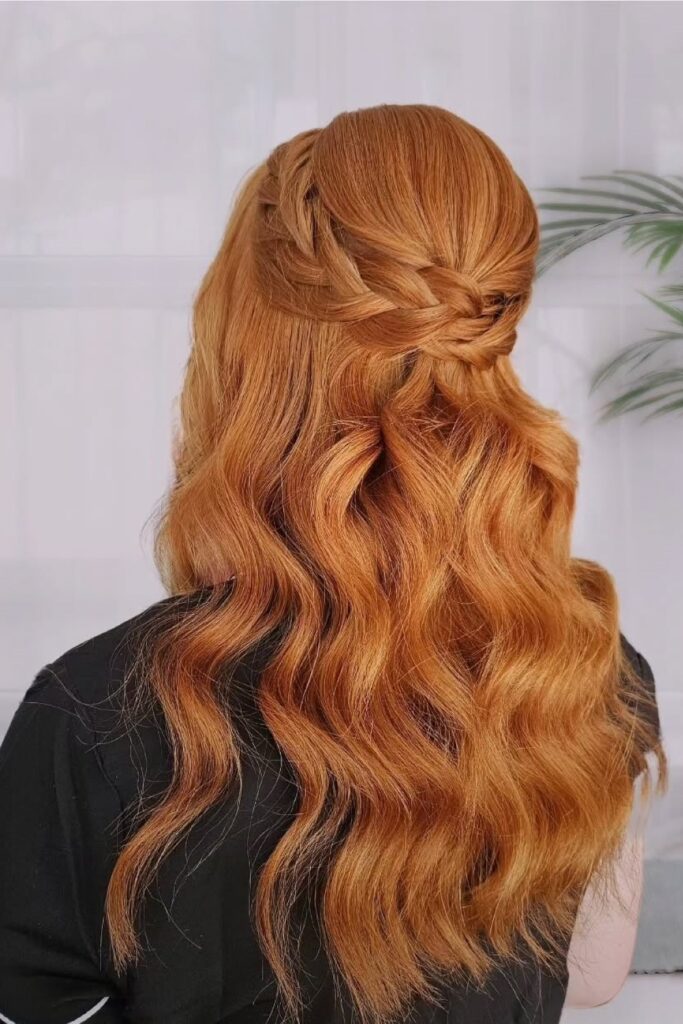 You reach for this half-down style when you want loose waves with small braid detail.