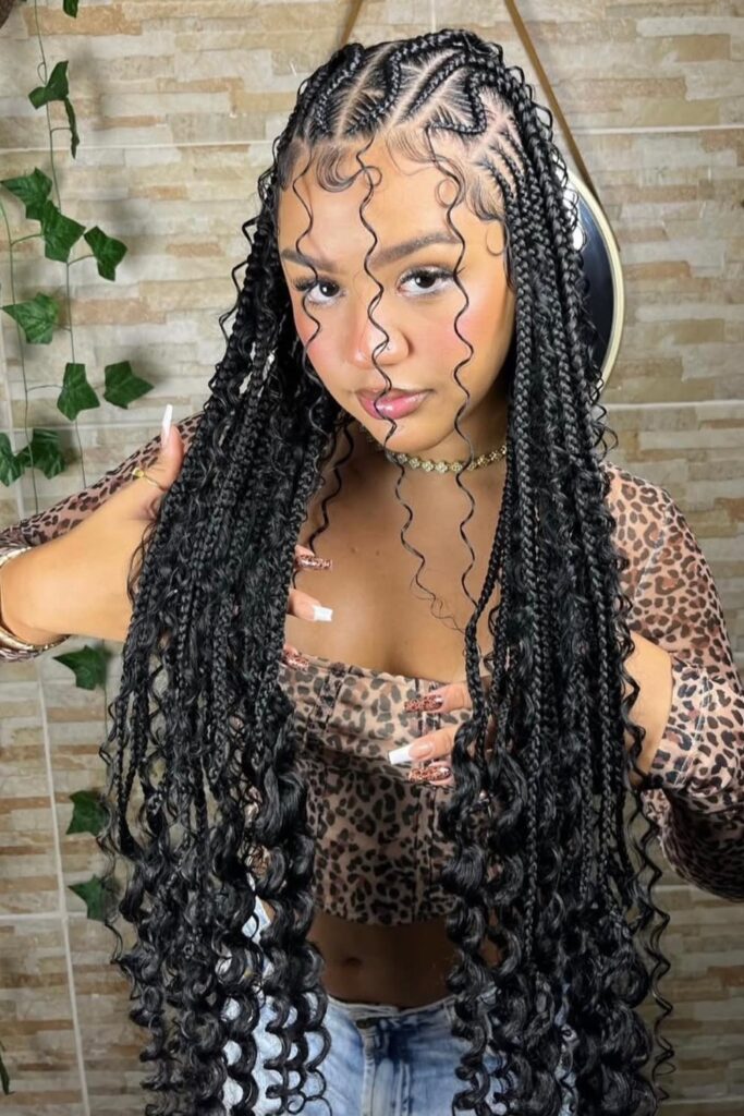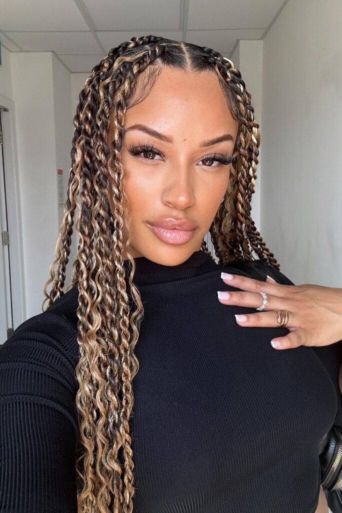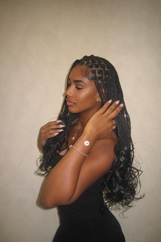 You shape these knotless braids with curled ends to add soft motion without heat.