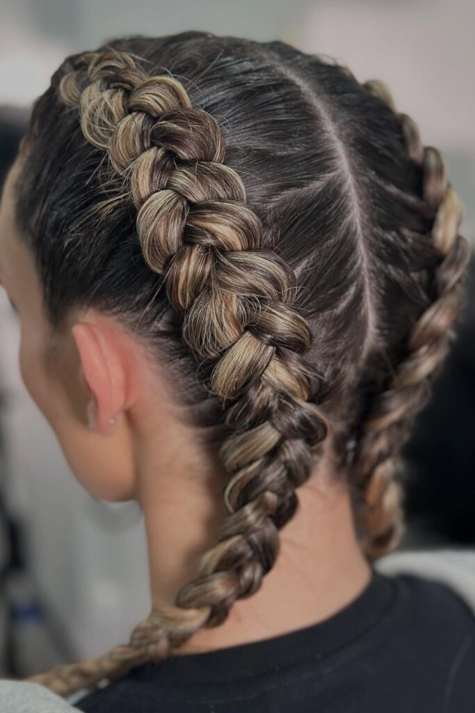 You shape these double dutch braids to sit close to the scalp for a clean, sharp frame.