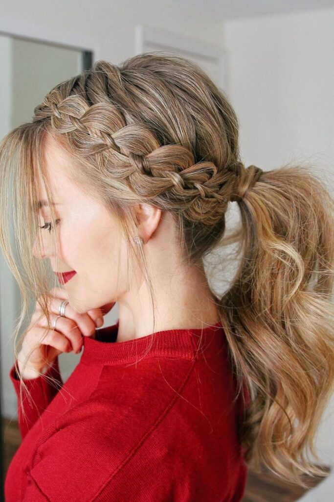 You tuck the braid across the crown to keep the style secure without effort.