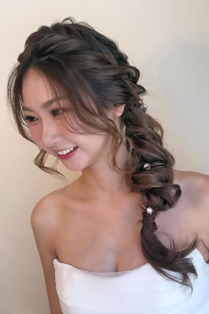 You guide the hair into a side braid with pearls placed through the length for a quiet shine.