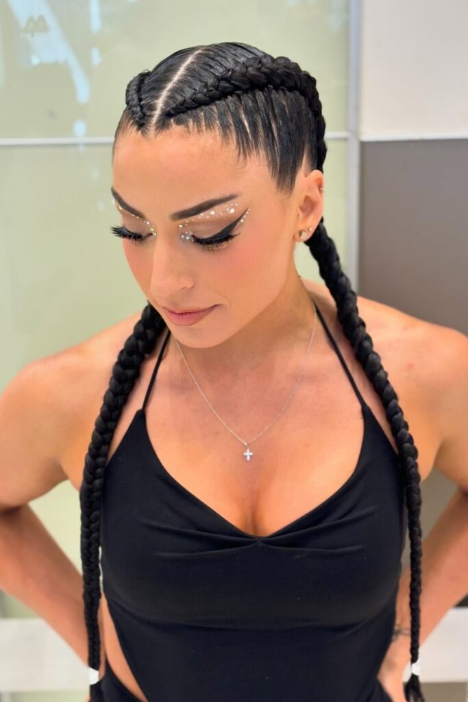 You note how these two sharp braids sit tight against the scalp for a bold shape.