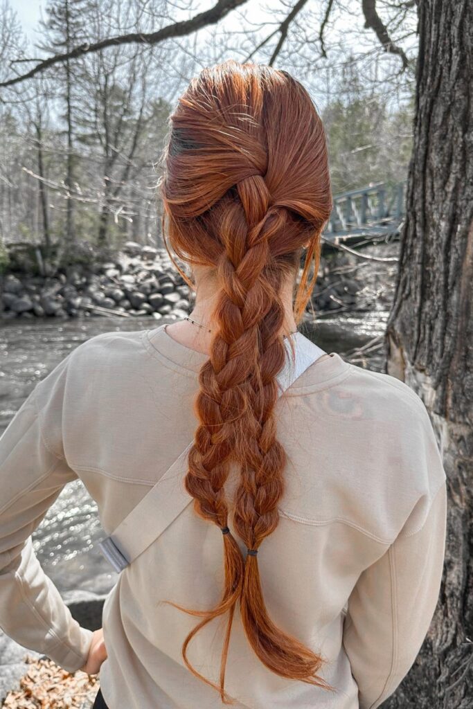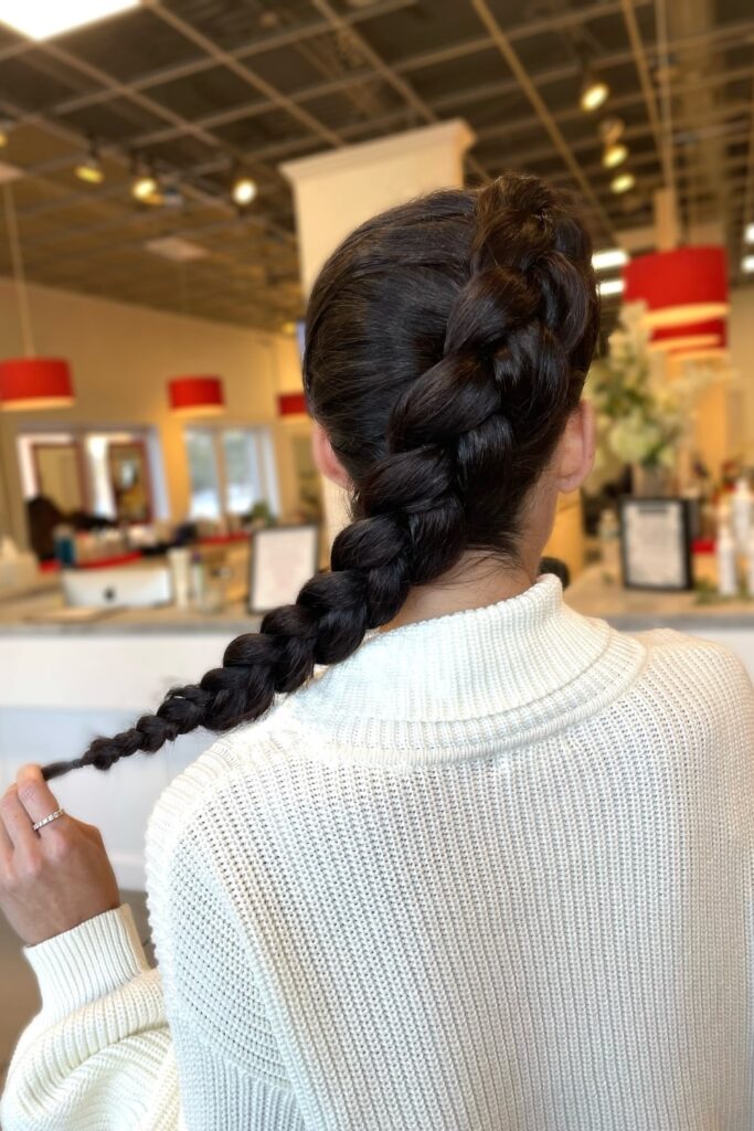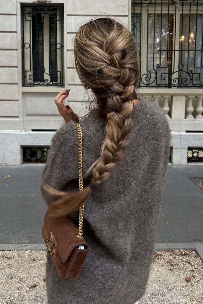 You place the braid lower so the back stays soft under heavy sweaters.