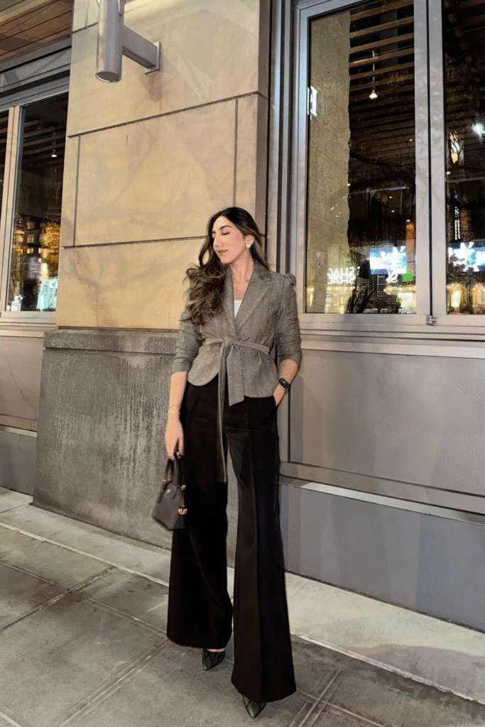 Grey Belted Blazer with Black Wide-Leg Pants