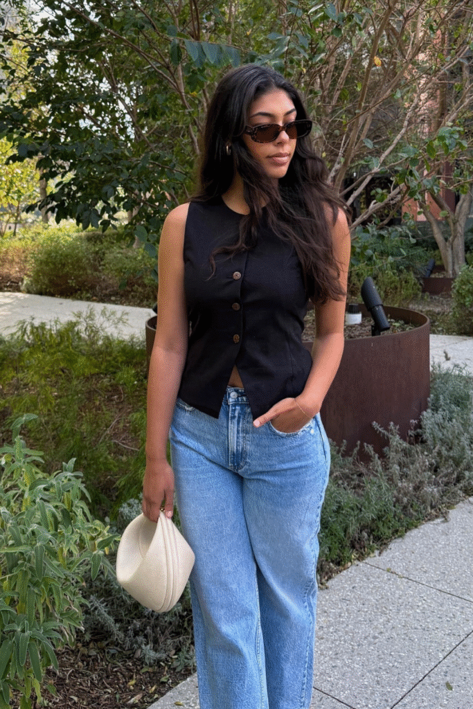 You show smart minimalism through a sleeveless vest paired neatly with relaxed jeans.