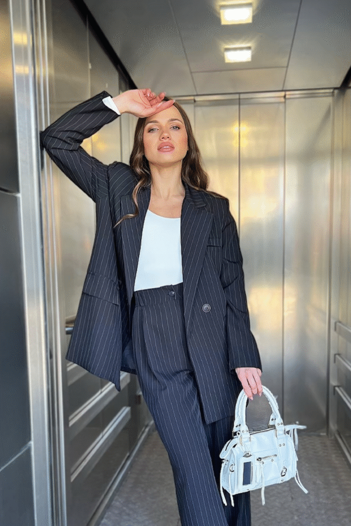 You channel authority through a pinstripe blazer that sits confidently over straight trousers.