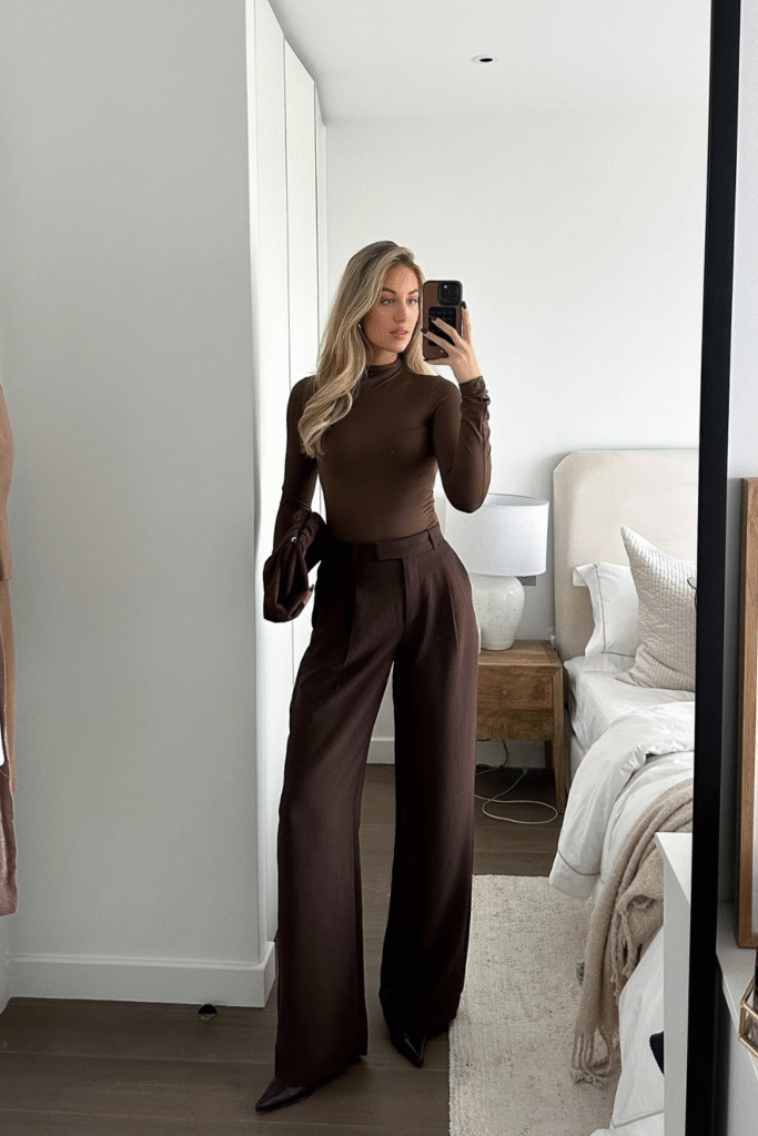 You elevate subtlety when you pick a chocolate turtleneck tucked into matching high-waist trousers.