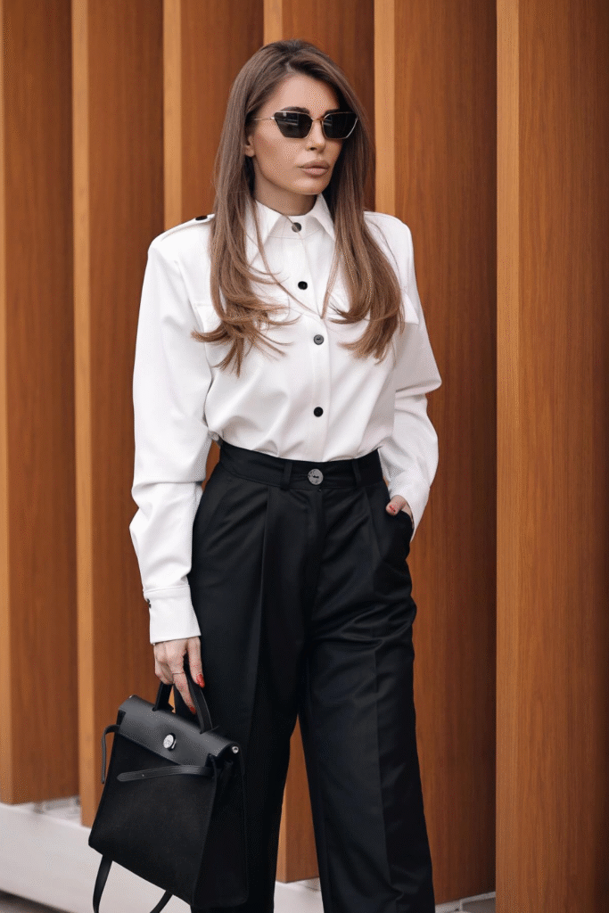 You express timeless confidence by combining a crisp white shirt with tailored black trousers.