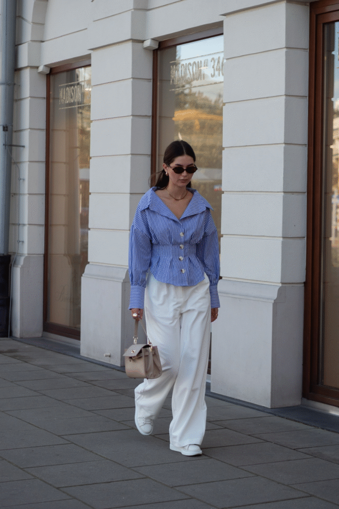 You keep the ensemble airy by pairing it with wide white trousers that balance volume.