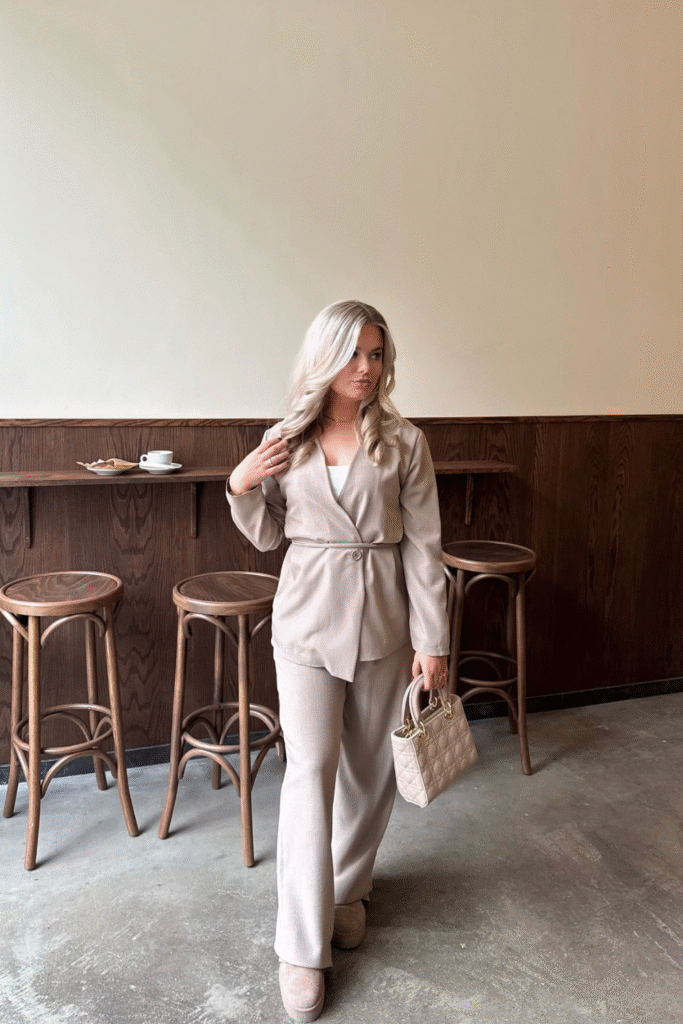 You bring calm professionalism with a belted beige co-ord that wraps softly around the body.