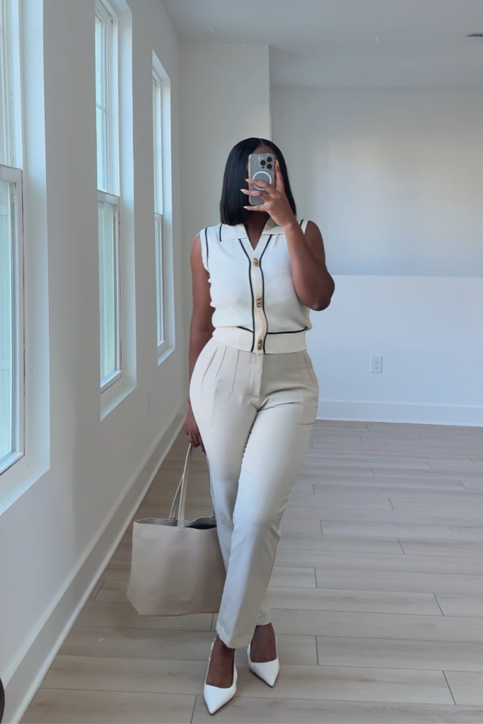 You project quiet confidence when you go for a sleeveless knit top tucked neatly into cream pants.