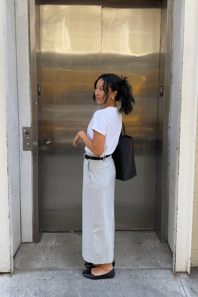 White Tee with Grey Maxi Skirt
