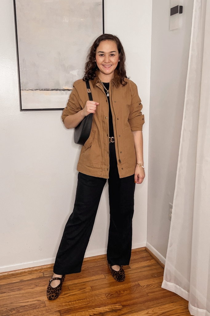 Camel Utility Jacket with Black Outfit
