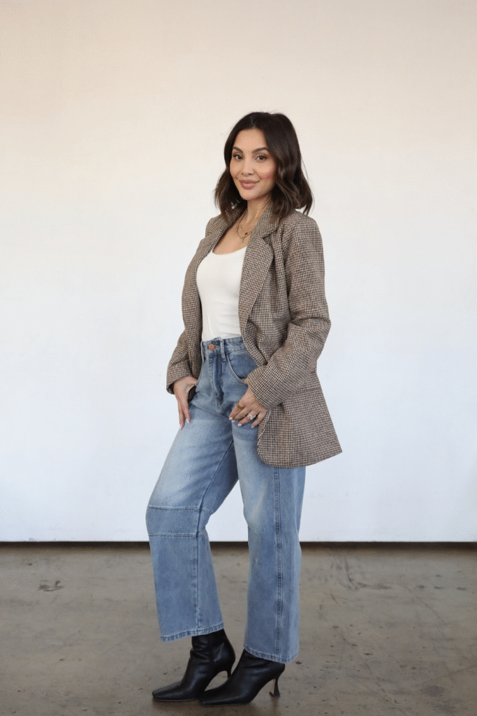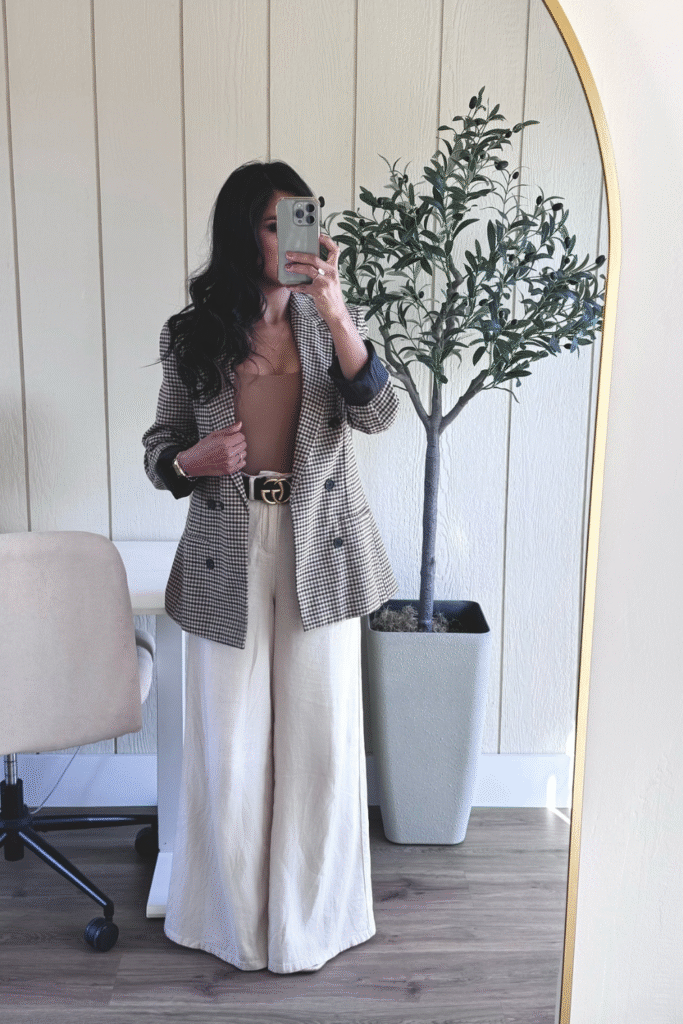 You pull classic charm into modern rhythm by pairing a check blazer with light flowy trousers.