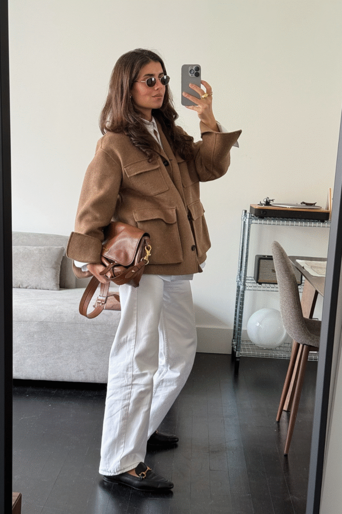 Camel Utility Jacket with White Jeans
