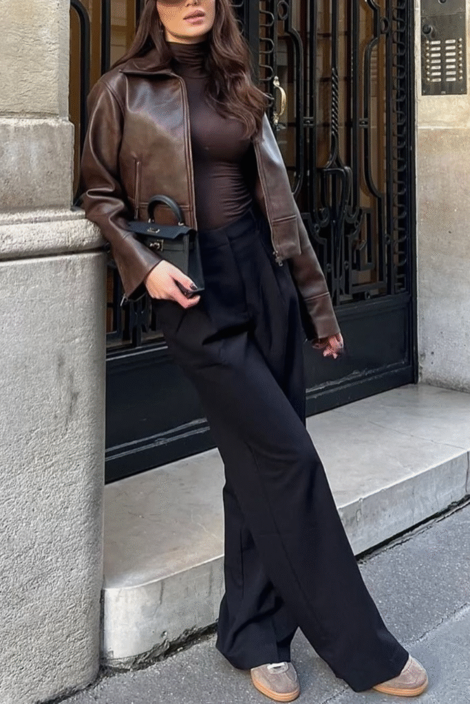 Brown Leather Jacket with Black Trousers