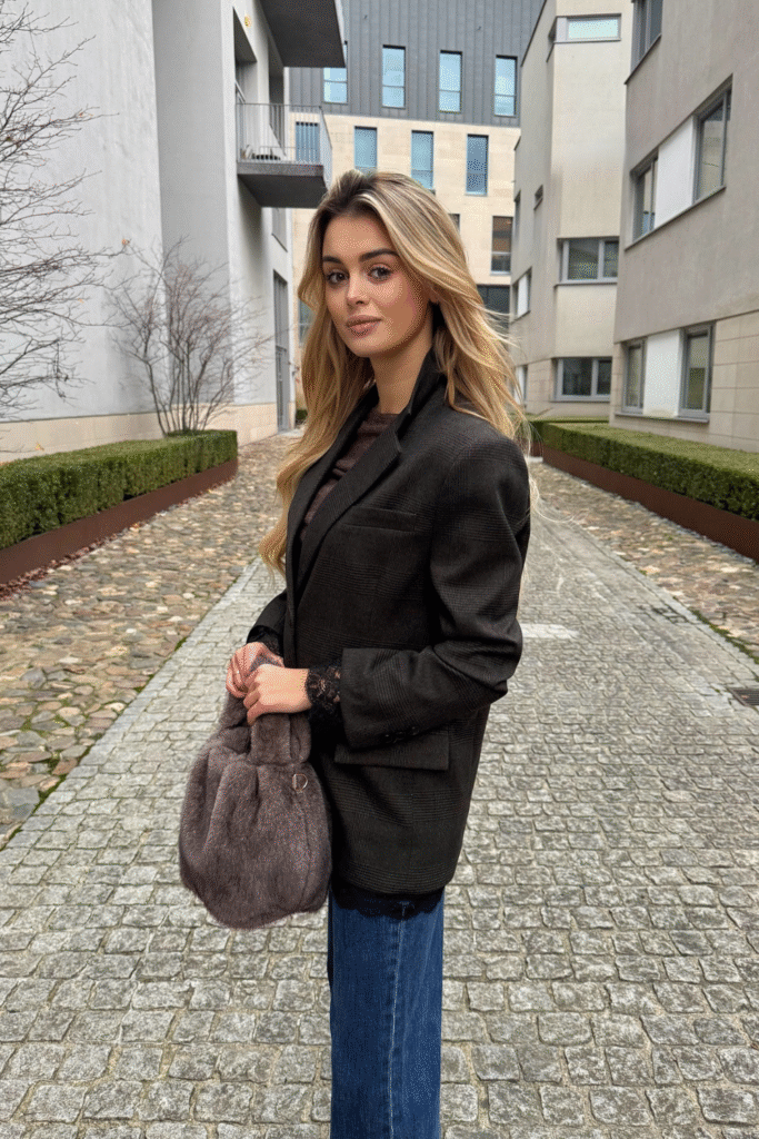 A neutral faux fur bag softens the tone, making it ideal for city meetings or chilly office mornings.