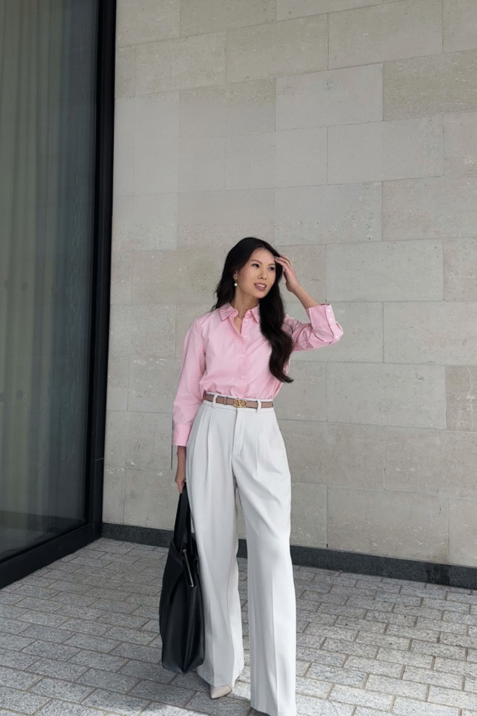 You bring freshness into formality with a pastel shirt tucked precisely into white tailored pants.