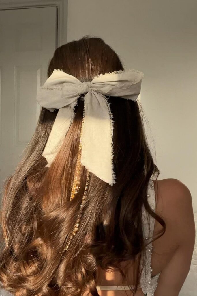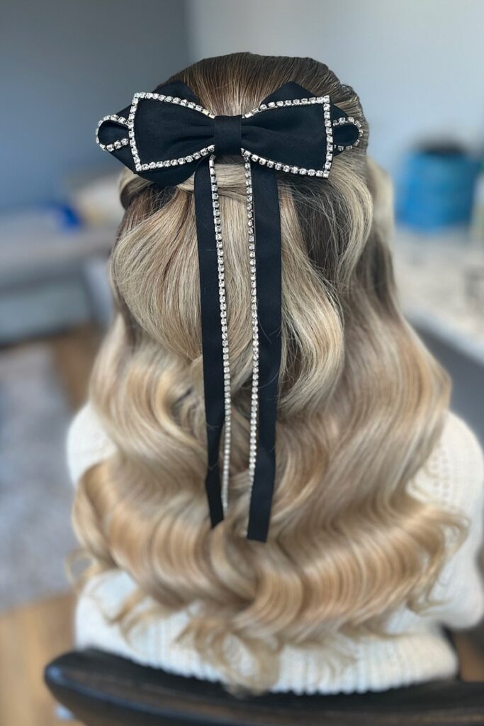 Cause the bow sits on the half-up anchor, it keeps the hair away from your face while still feeling elegant for events.