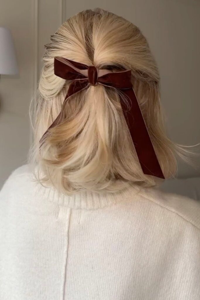 You pick a velvet bow that adds a warm tone to soft blonde layers.