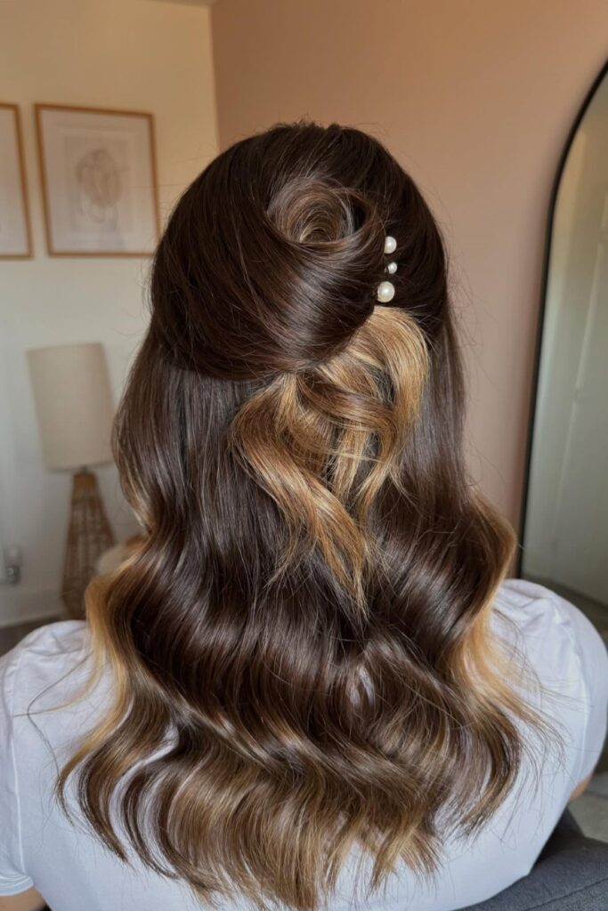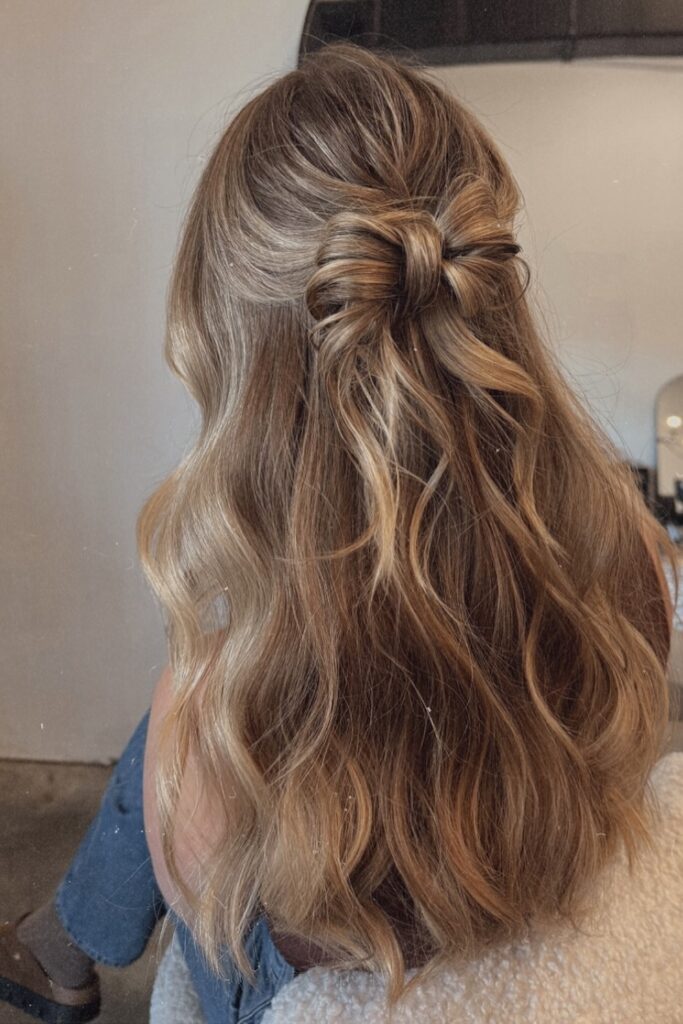 You shape a gentle half-up look with a loose bow that blends into soft waves.