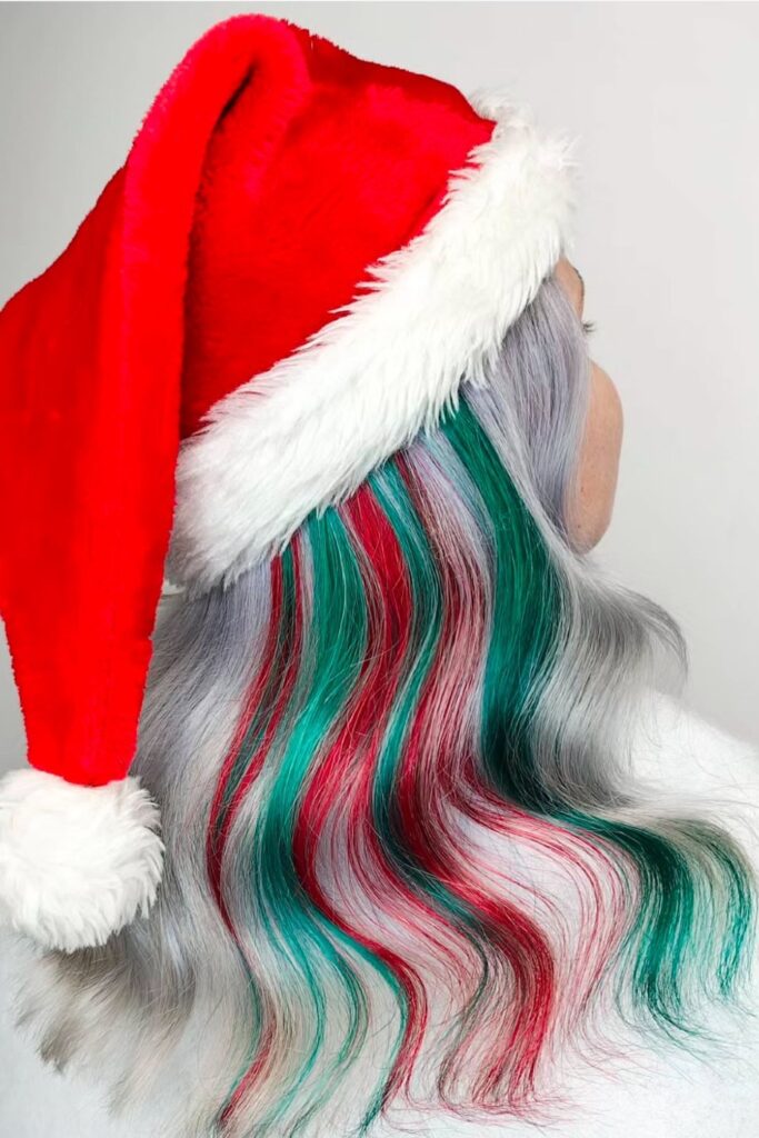 You reveal a festive statement with these red and green streaks that peek out under the hat.