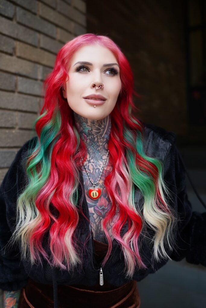You showcase rich red tones that shift into dark green streaks for a bold holiday contrast.