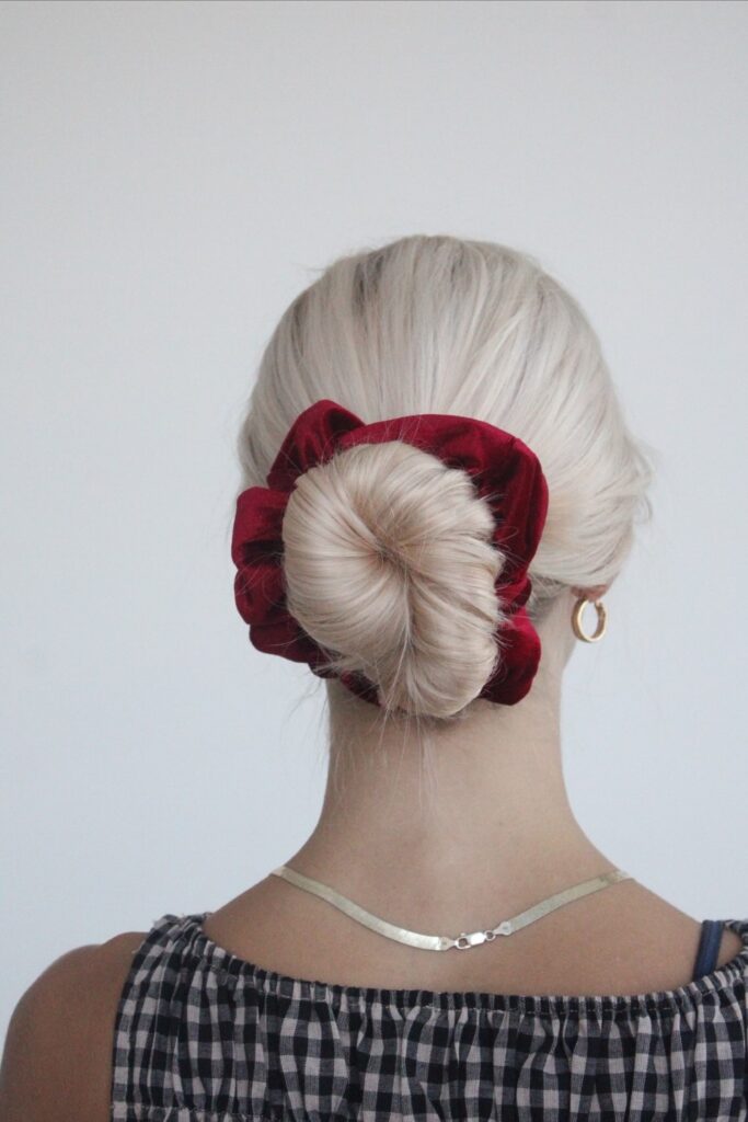 You elevate the shape with a deep red velvet scrunchie that adds instant Christmas charm.