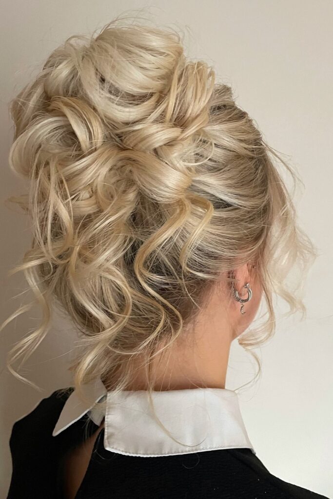 You tease soft curls up toward the crown to form a full stacked shape with a romantic touch.