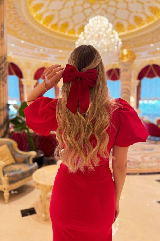 You finish the look with a structured red bow that instantly fits Christmas dress codes.