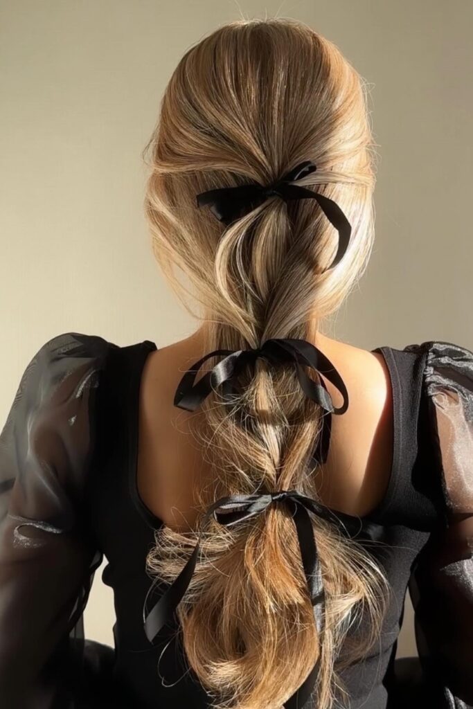 You shape a loose bubble braid and tie each section with slim black ribbons for a playful festive touch.