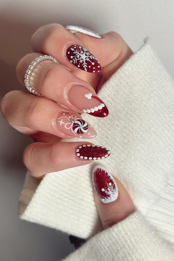 You can wear this mix of candy swirls, reindeer art, and soft French tips all season long.