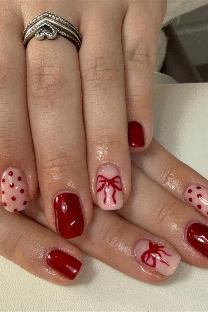 You will alternate solid red and nude nails, then add mini bows and dots with a fine brush.