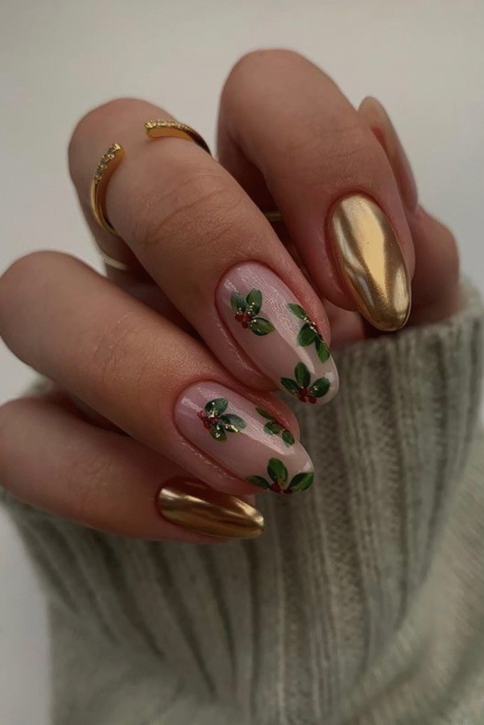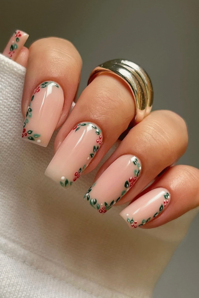 You will start with a matte nude base, then draw soft green sprigs with a fine brush, it is minimal but feels beautifully festive.
