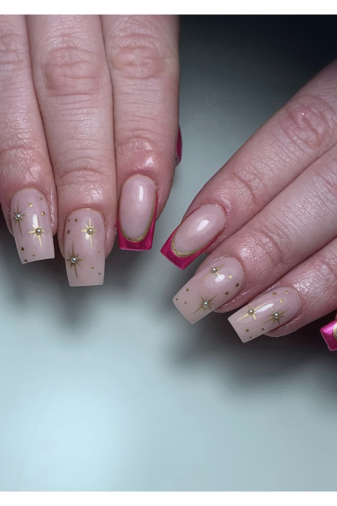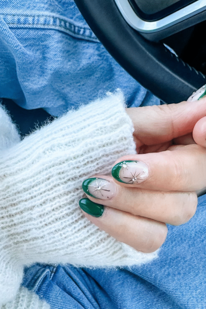 Paint a nude base, add a rich emerald arc, then place tiny silver stars or rhinestones for that perfect hint of glamour.