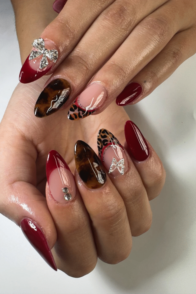You can mix deep red polish with tortoise patterns and silver bows for that luxe finish.