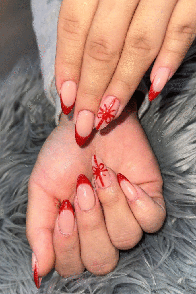 You can wear this sparkly red ribbon design for gift shopping days or date nights.