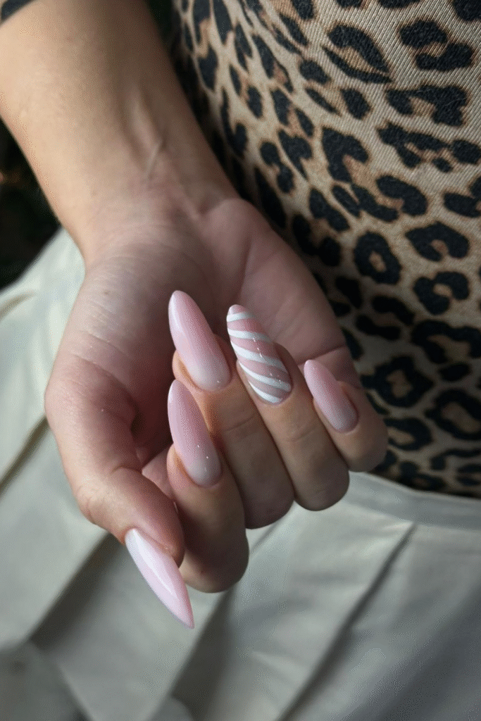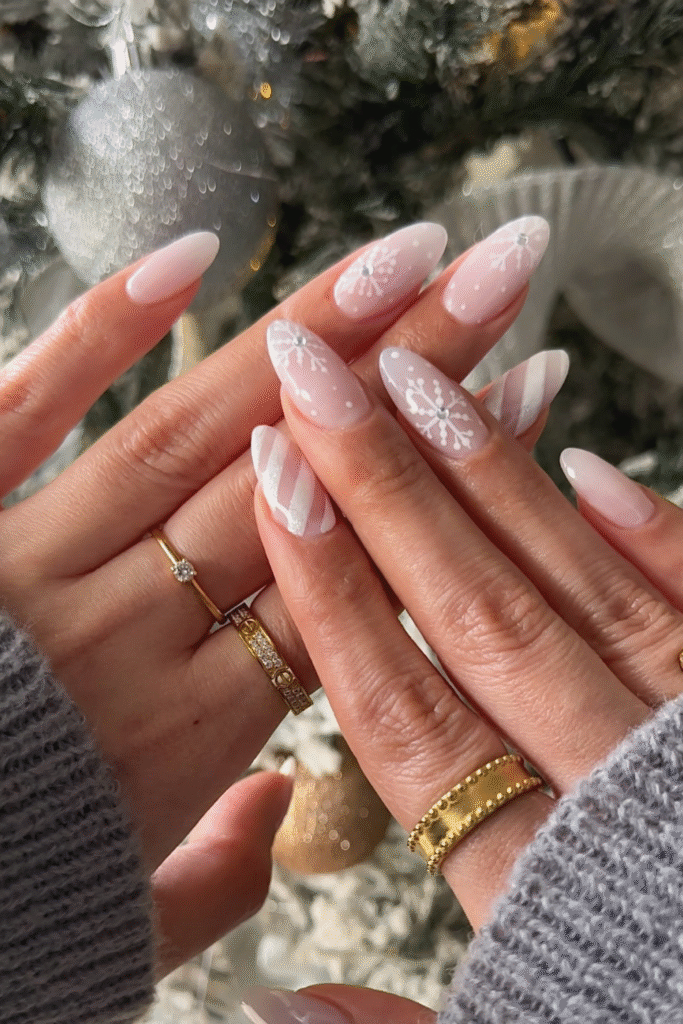 You will paint a sheer pink base, then alternate between snowflake art and candy stripes.