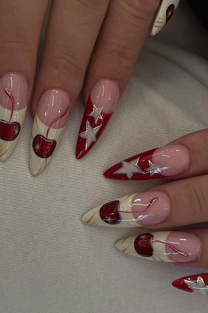 You’ll start with glossy red and off-white polish, then add silver stars for that dramatic accent.