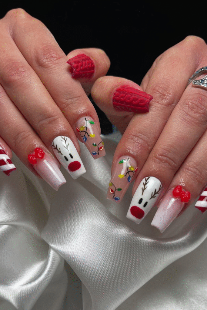The red cable detail gives sweater energy, while the white nails with lights and Rudolph faces make it feel like Christmas joy on your fingertips.