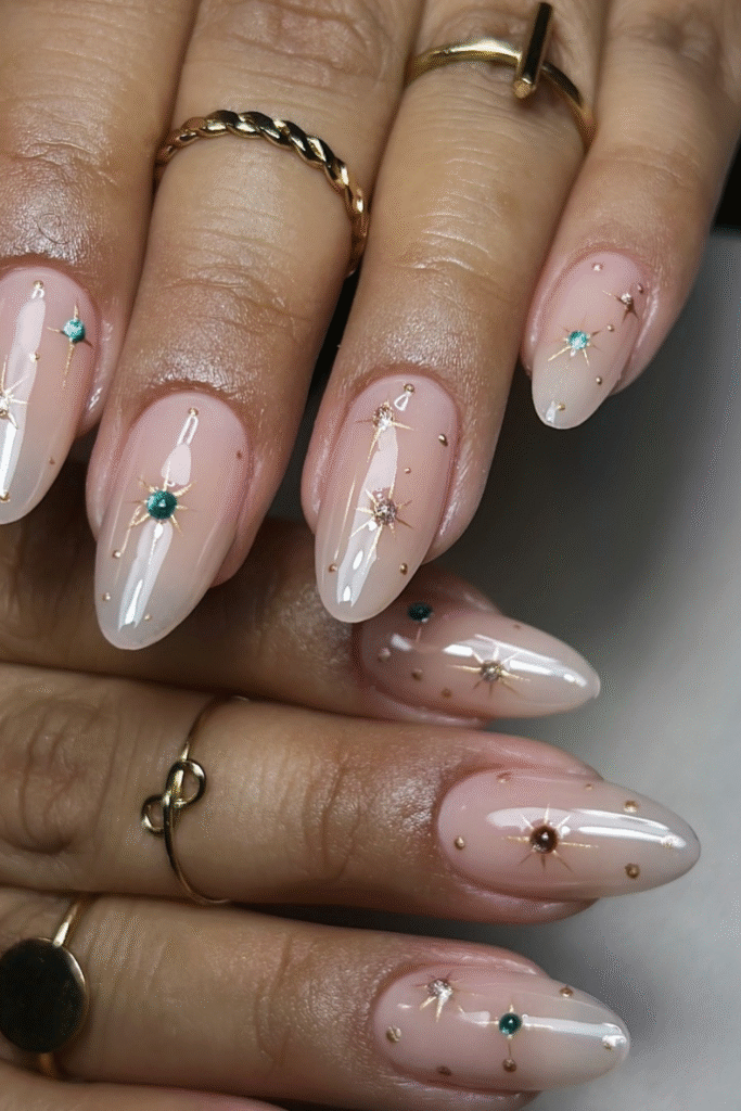 The nude base keeps things subtle, while golden starbursts and green gems make your nails look like little constellations sparkling in December air.